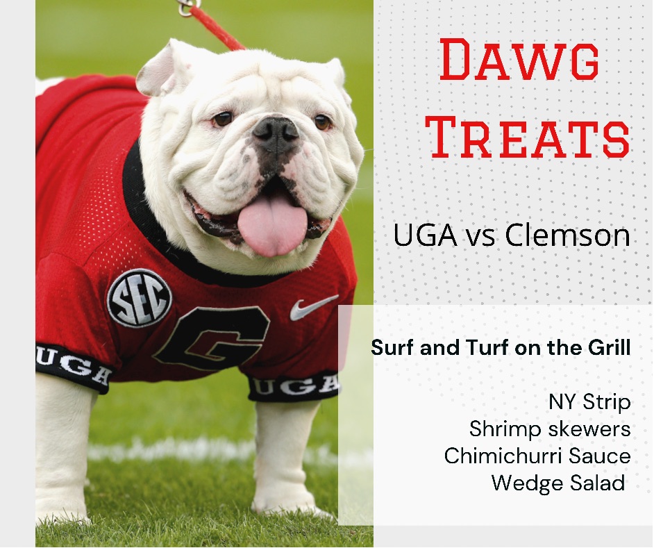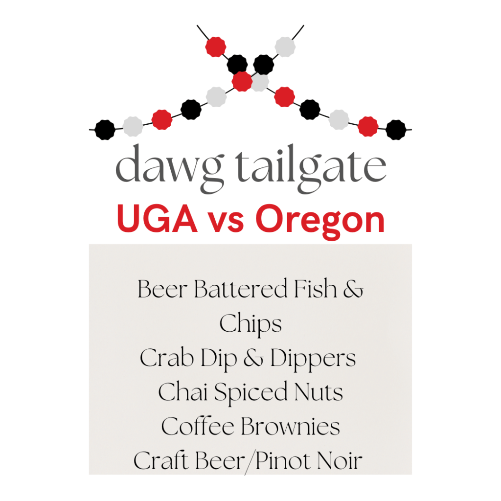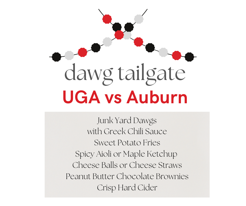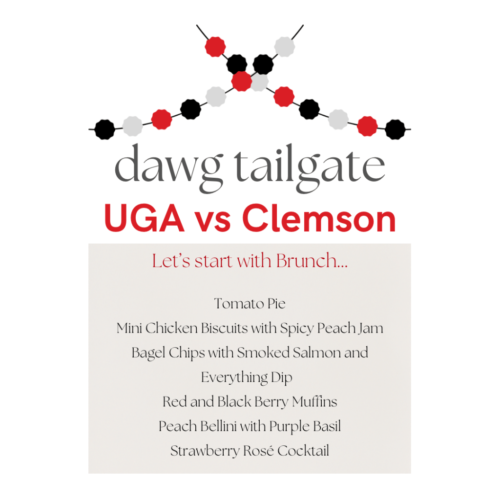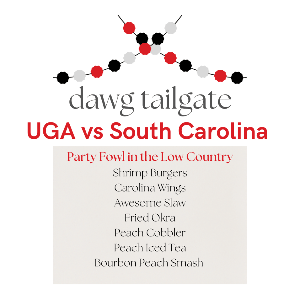 For years, I have been planning game day spreads for family and friends as we cheer for the Dawgs Between the Hedges, in our family room, and even across oceans thanks to Zoom. I want to inspire you to spend Saturday with people you love cheering for your favorite team. Message me if I can create a custom menu for your big game!